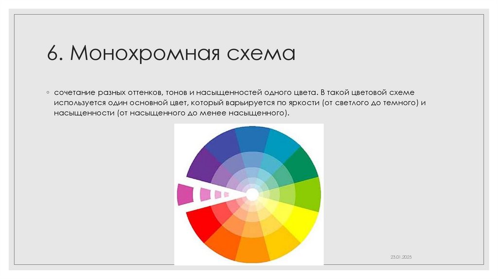 6. Монохромная схема◦ сочетание разных оттенков, тонов и насыщенностей одного цвета. В такой цветовой схеме