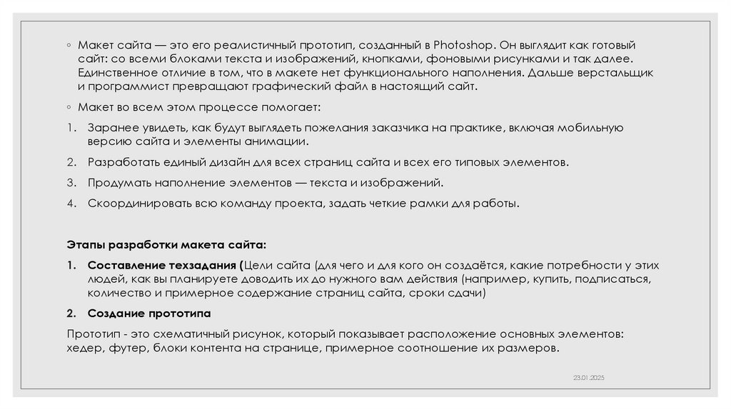 ◦ Макет сайта — это его реалистичный прототип, созданный в Photoshop. Он выглядит как готовыйсайт: со всеми блоками текста и изображений, кнопками, фоновыми рисунками и так далее.