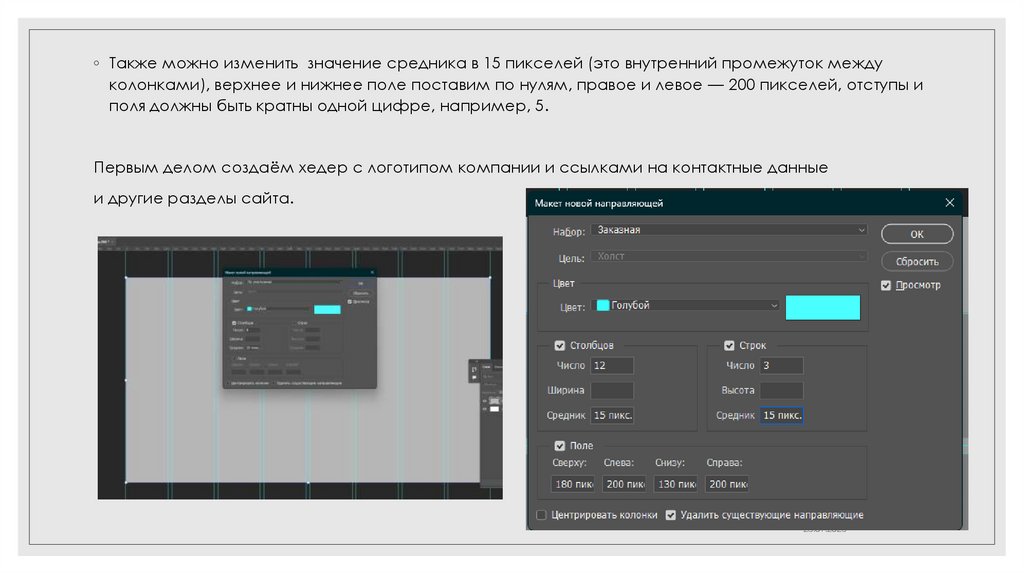 ◦ Также можно изменить значение средника в 15 пикселей (это внутренний промежуток междуколонками), верхнее и нижнее поле поставим по нулям, правое и левое — 200 пикселей, отступы и