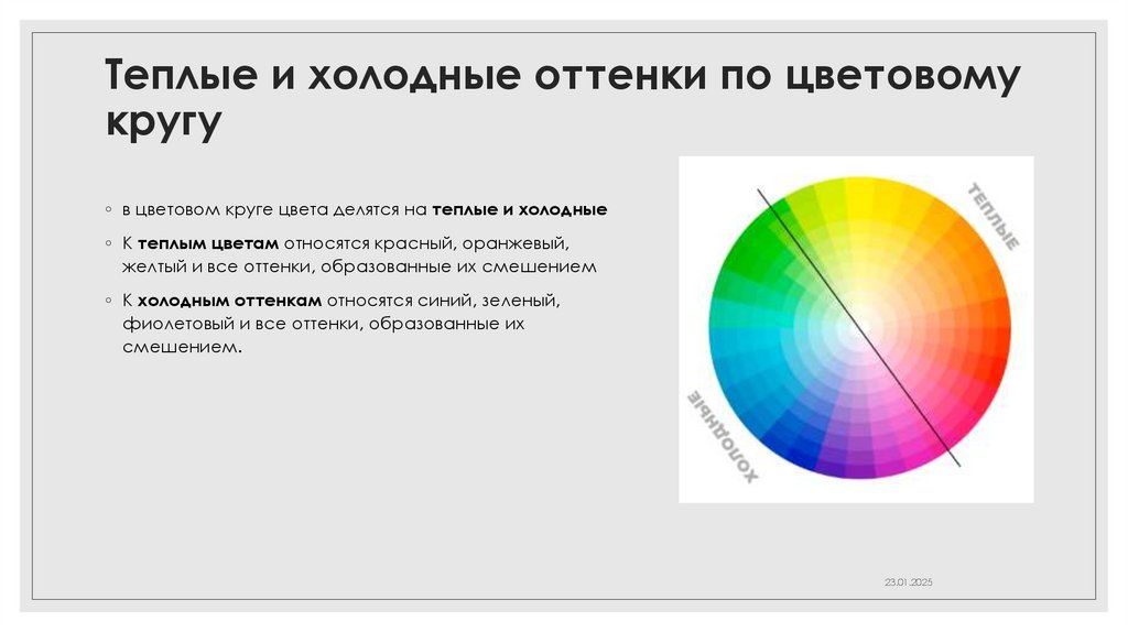 ◦ в цветовом круге цвета делятся на теплые и холодные