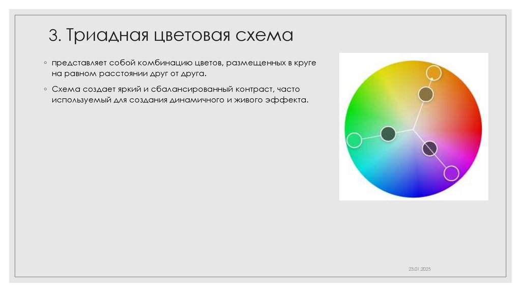 3. Триадная цветовая схема◦ представляет собой комбинацию цветов, размещенных в круге