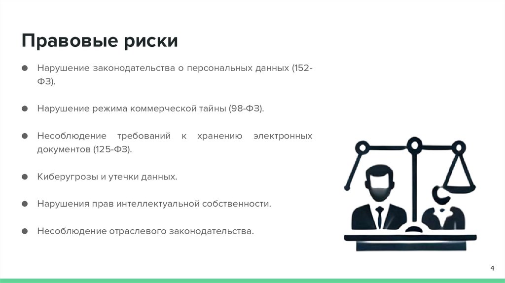Правовые риски● Нарушение законодательства о персональных данных (152ФЗ).