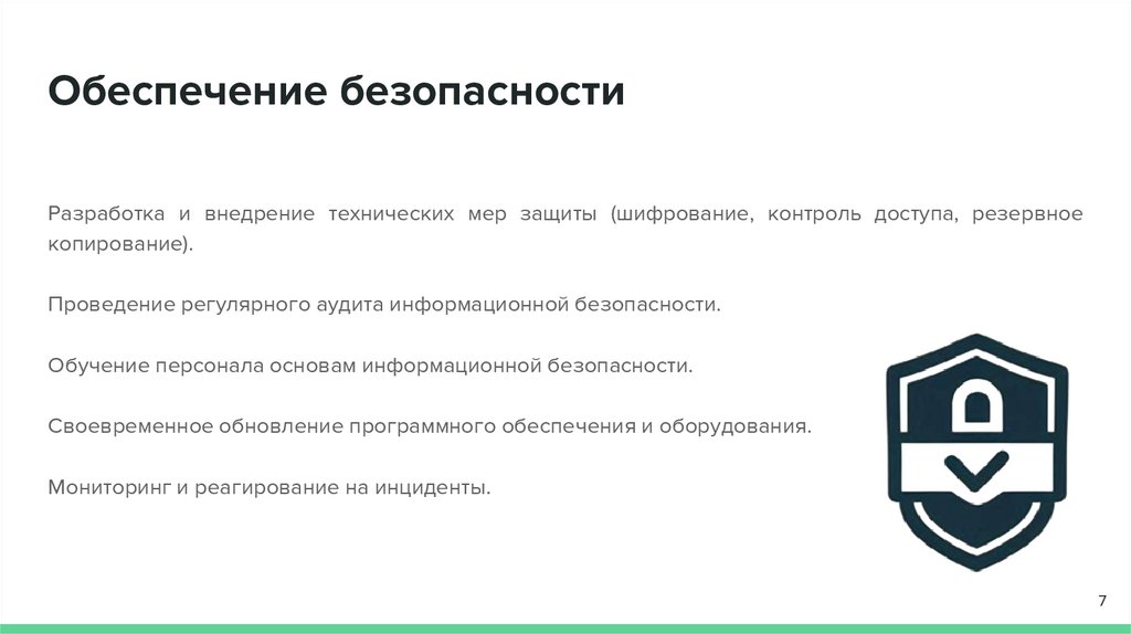 Обеспечение безопасностиРазработка и внедрение технических мер защиты (шифрование, контроль доступа, резервное