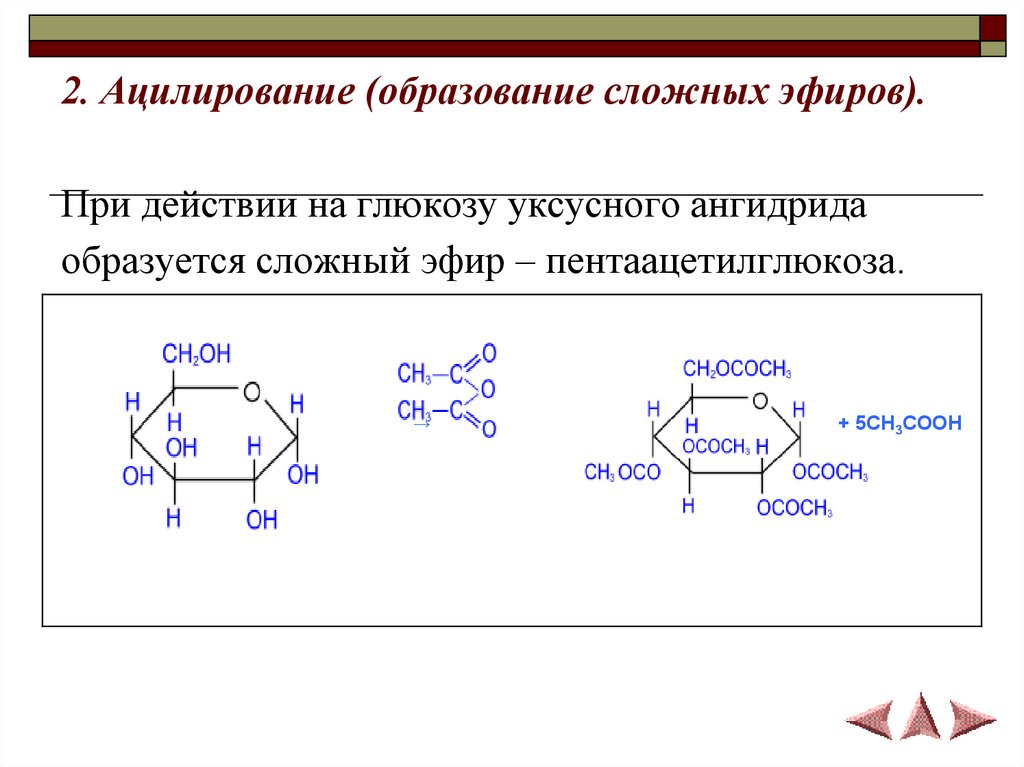 2. Ацилирование (образование сложных эфиров).При действии на глюкозу уксусного ангидрида