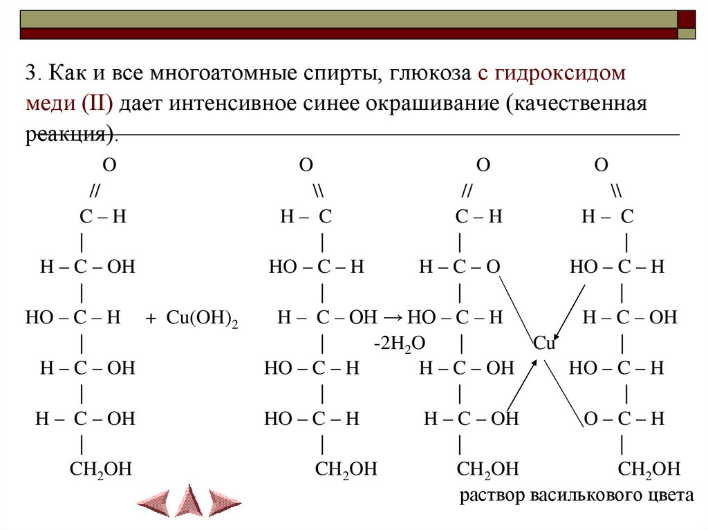 3. Как и все многоатомные спирты, глюкоза с гидроксидоммеди (II) дает интенсивное синее окрашивание (качественная