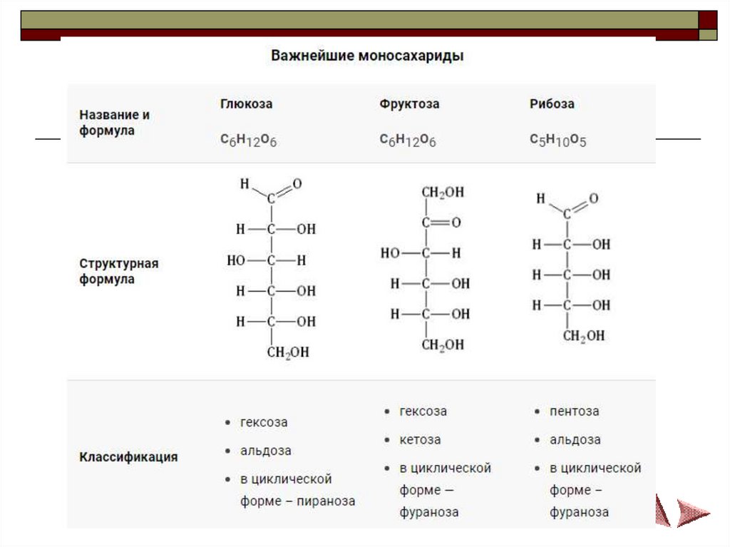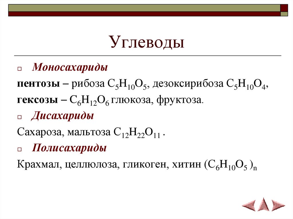 пентозы – рибоза C5H10O5, дезоксирибоза C5H10O4,