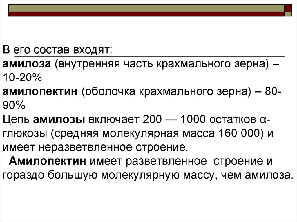 Цепь амилозы включает 200 — 1000 остатков αглюкозы (средняя молекулярная масса 160 000) и