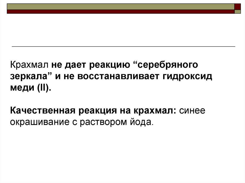 Крахмал не дает реакцию “серебряногозеркала” и не восстанавливает гидроксид