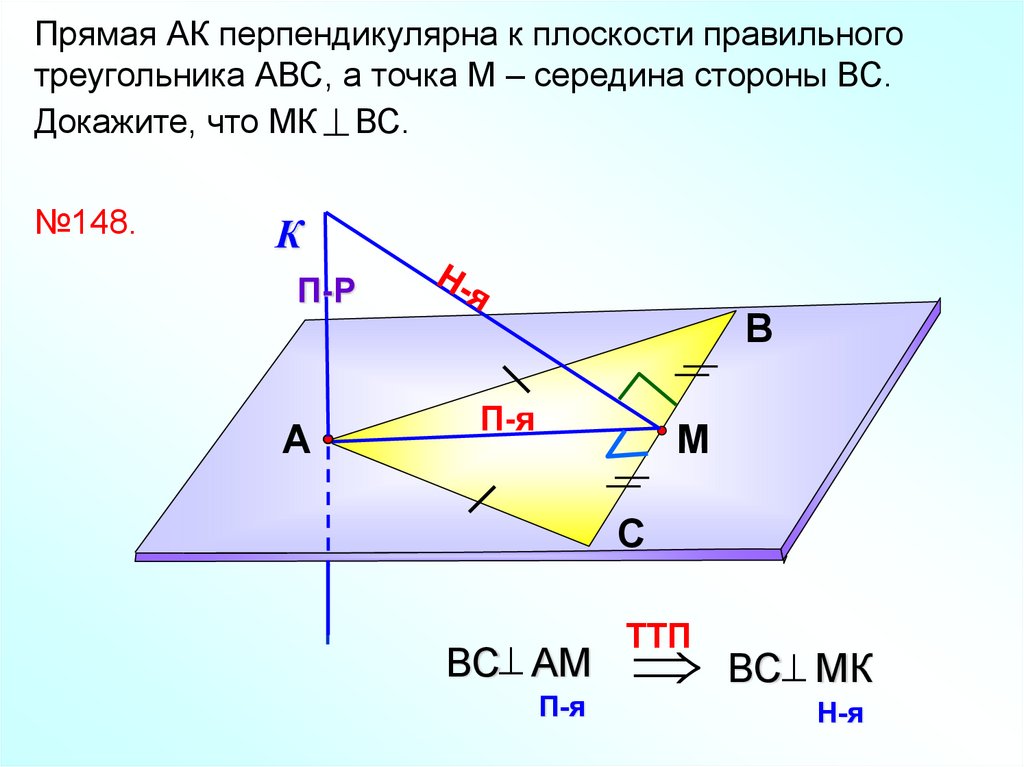 Прямая АК перпендикулярна к плоскости правильноготреугольника АВС, а точка М – середина стороны ВС.