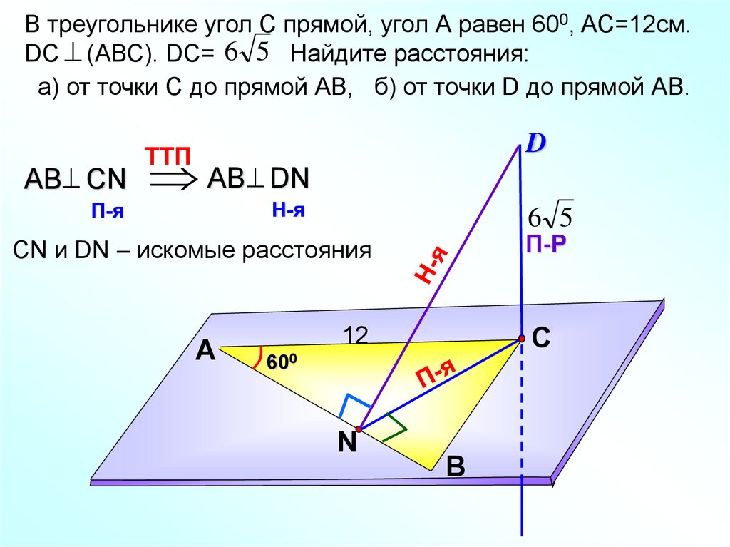 В треугольнике угол С прямой, угол А равен 600, AС=12см.DC (АВС). DC= 6 5 Найдите расстояния: