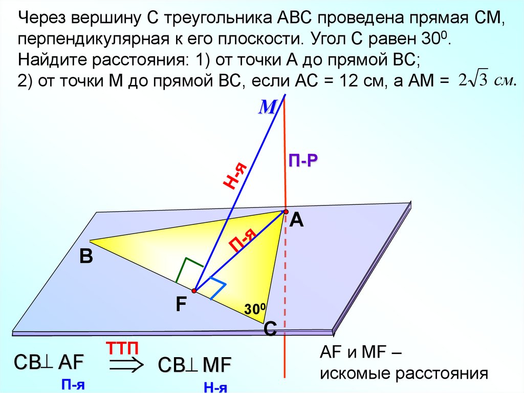 2) от точки М до прямой ВС, если АС = 12 см, а АМ = 2 3 см.