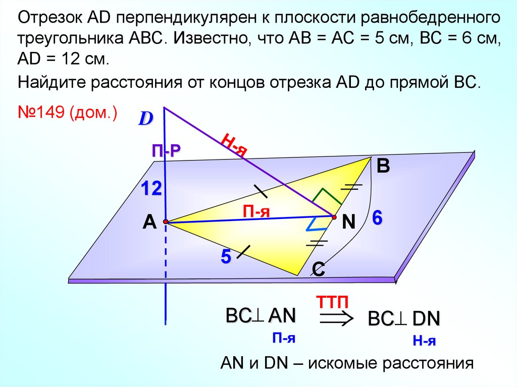 Отрезок АD перпендикулярен к плоскости равнобедренноготреугольника АВС. Известно, что АВ = АС = 5 см, ВС = 6 см,