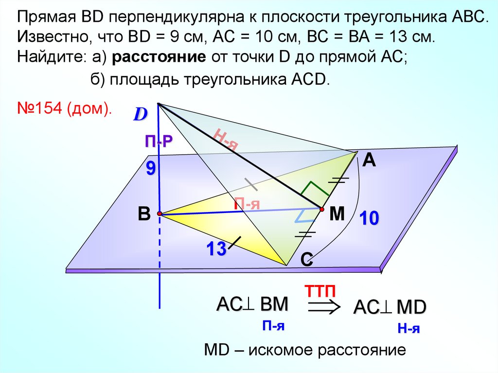 Прямая ВD перпендикулярна к плоскости треугольника АВС.Известно, что ВD = 9 см, АС = 10 см, ВС = ВА = 13 см.