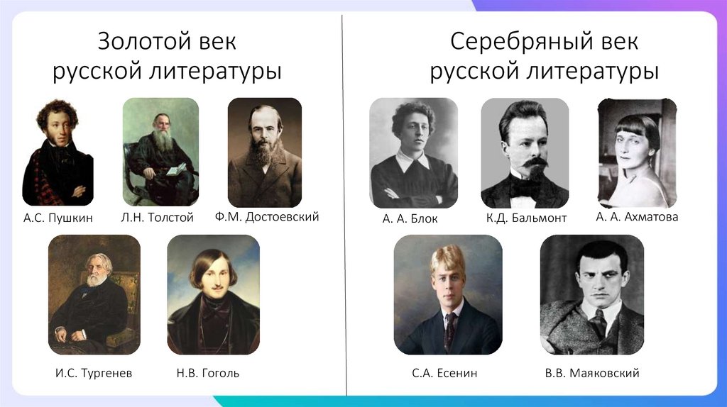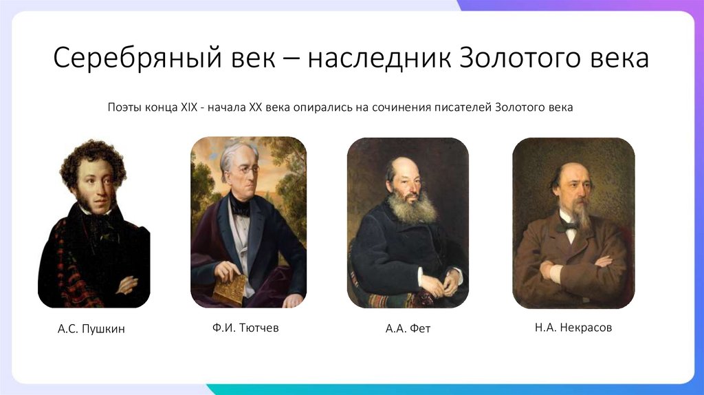 Серебряный век – наследник Золотого векаПоэты конца XIX - начала XX века опирались на сочинения писателей Золотого века