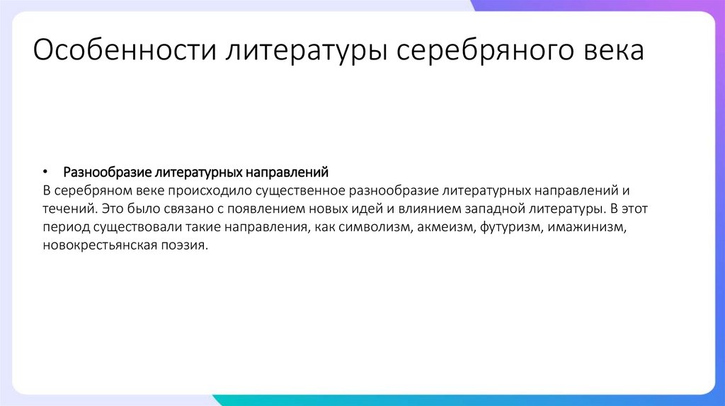 Особенности литературы серебряного века• Разнообразие литературных направлений