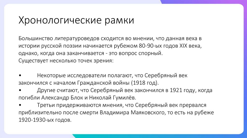 Хронологические рамкиБольшинство литературоведов сходится во мнении, что данная веха в