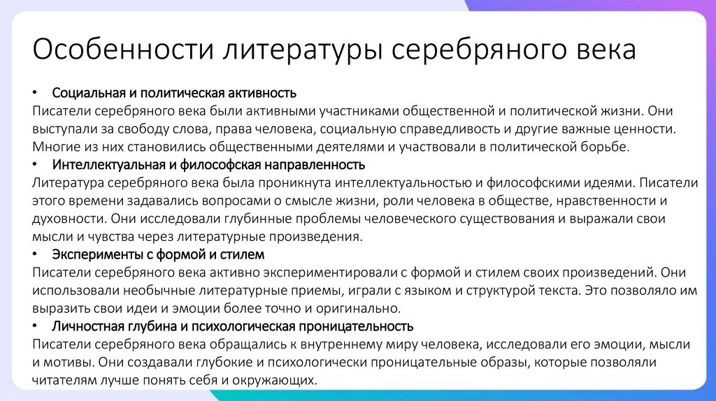 Литература серебряного века была проникнута интеллектуальностью и философскими идеями. Писатели