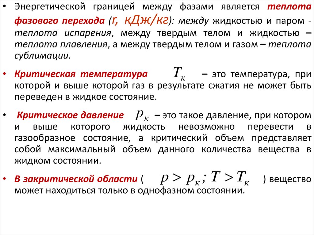 • Энергетической границей между фазами является теплотафазового перехода (r, кДж/кг): между жидкостью и паром теплота испарения, между твердым телом и жидкостью –