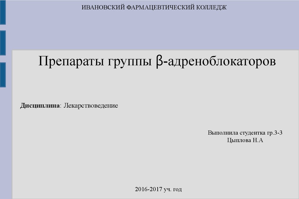 ИВАНОВСКИЙ ФАРМАЦЕВТИЧЕСКИЙ КОЛЛЕДЖПрепараты группы β-адреноблокаторов