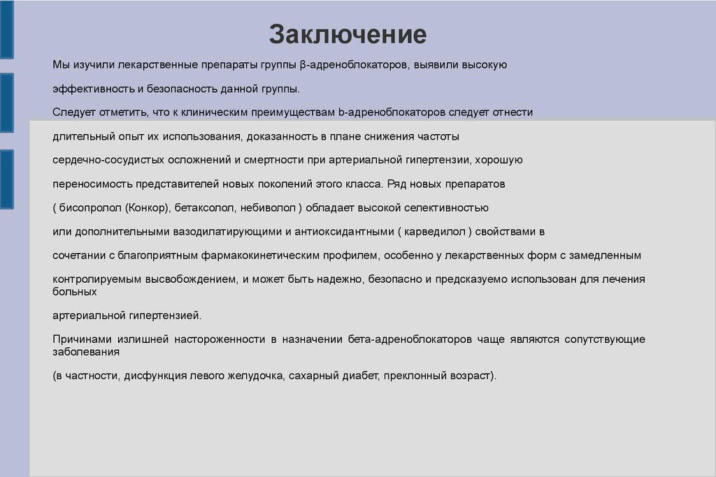 ЗаключениеМы изучили лекарственные препараты группы β-адреноблокаторов, выявили высокую