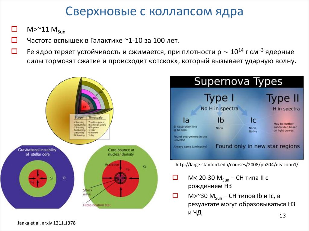 Fe ядро теряет устойчивость и сжимается, при плотности ρ ∼ 1014 г см−3 ядерные