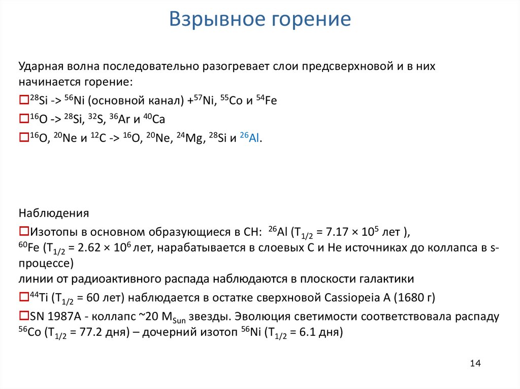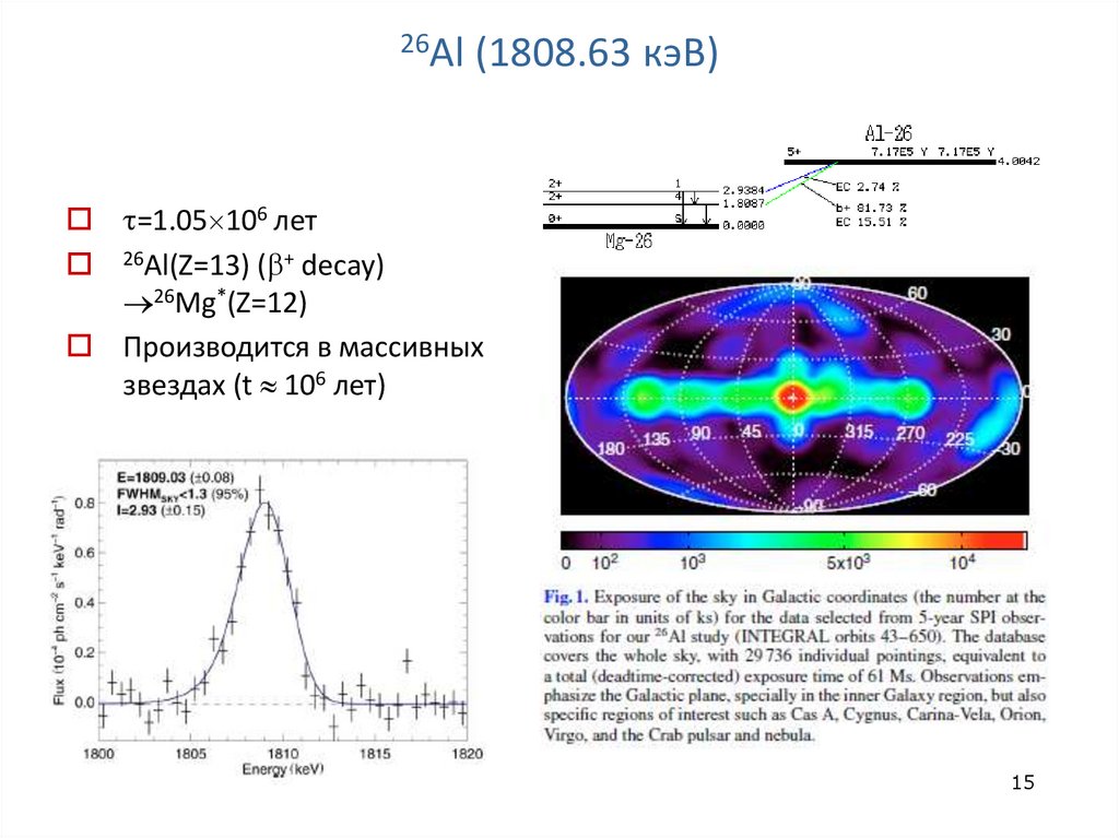 Изотопы в основном образующиеся в СН: 26Al (T1/2 = 7.17 × 105 лет ),