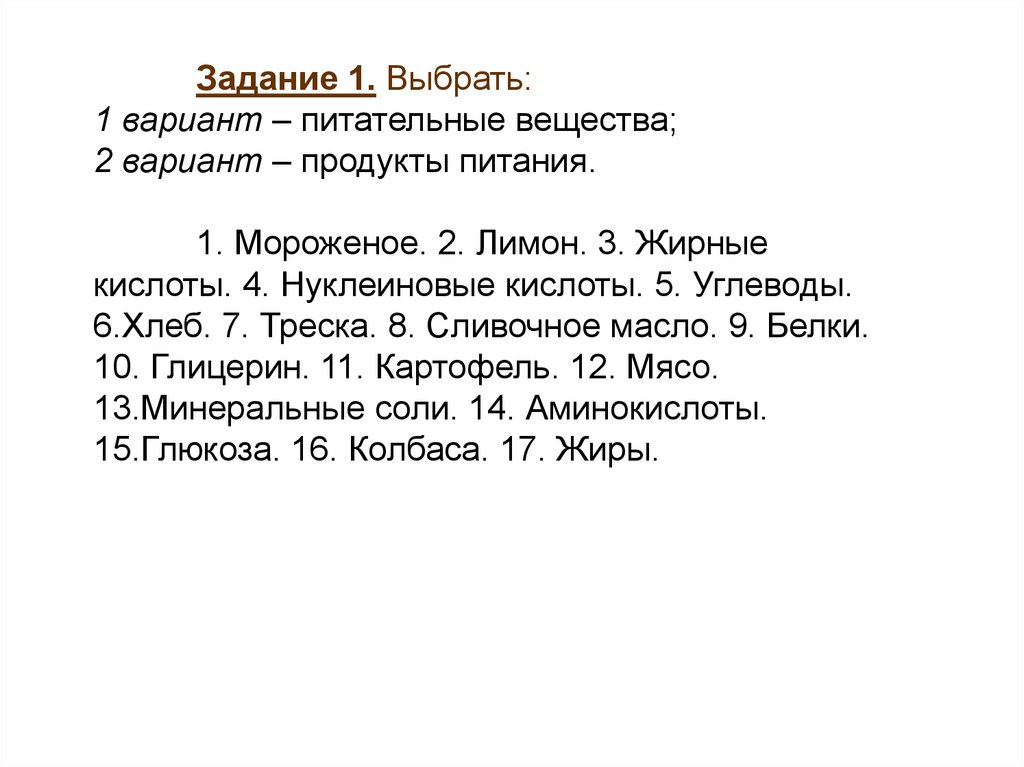 Задание 1. Выбрать:1 вариант – питательные вещества;