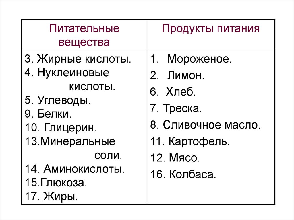 15.Глюкоза. 16. Колбаса. 17. Жиры.