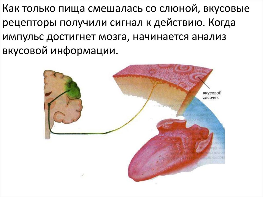Как только пища смешалась со слюной, вкусовыерецепторы получили сигнал к действию. Когда