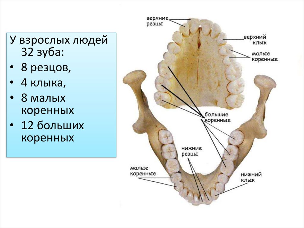У взрослых людей32 зуба: