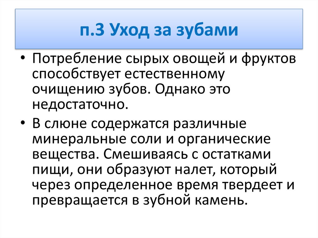п.3 Уход за зубами• Потребление сырых овощей и фруктов