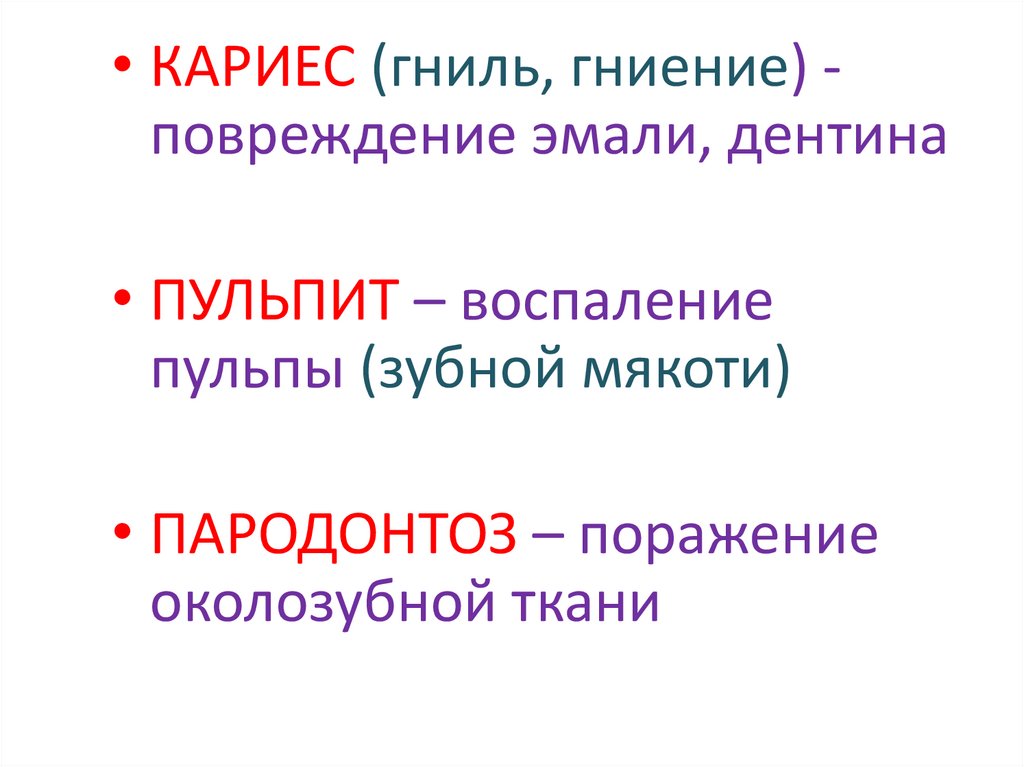 • КАРИЕС (гниль, гниение) повреждение эмали, дентина• ПУЛЬПИТ – воспаление