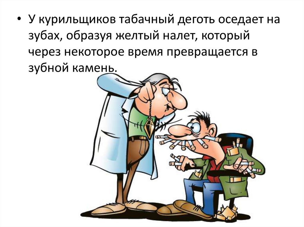 • У курильщиков табачный деготь оседает назубах, образуя желтый налет, который
