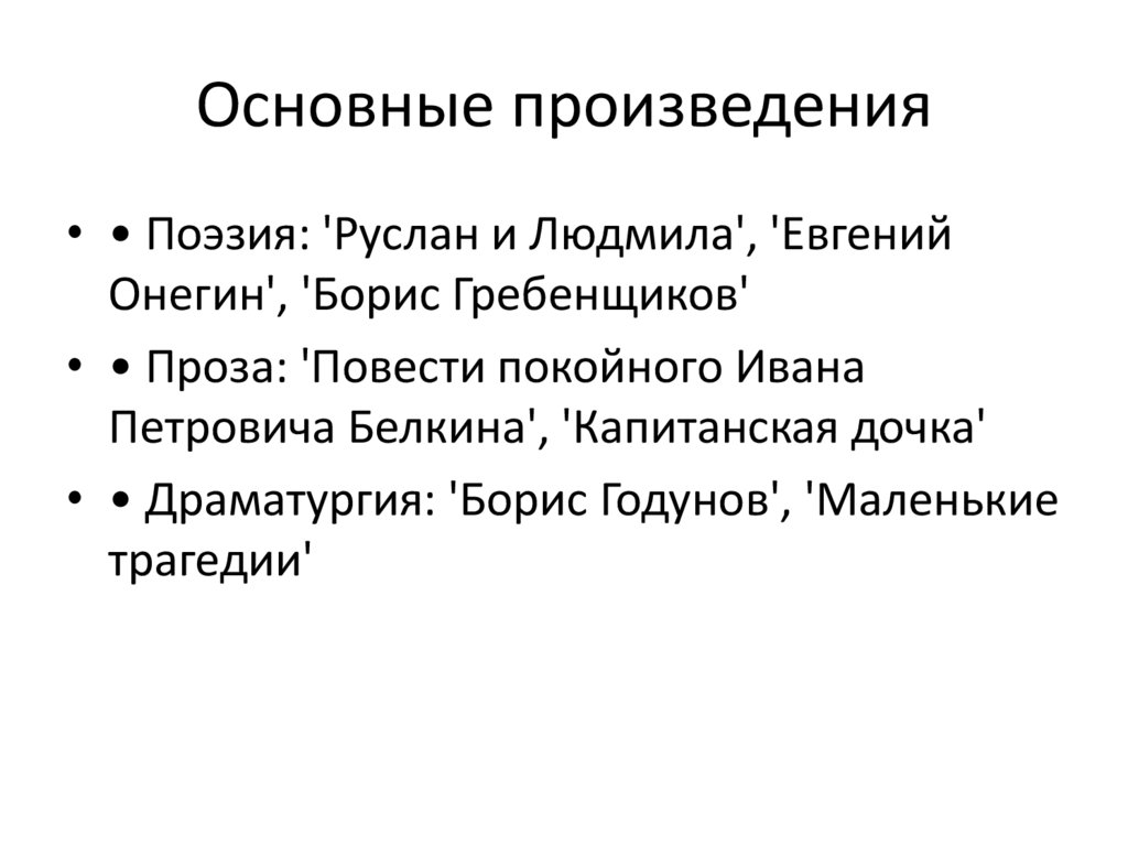 Основные произведения• • Поэзия: 'Руслан и Людмила', 'Евгений