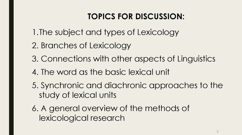 TOPICS FOR DISCUSSION:1.The subject and types of Lexicology