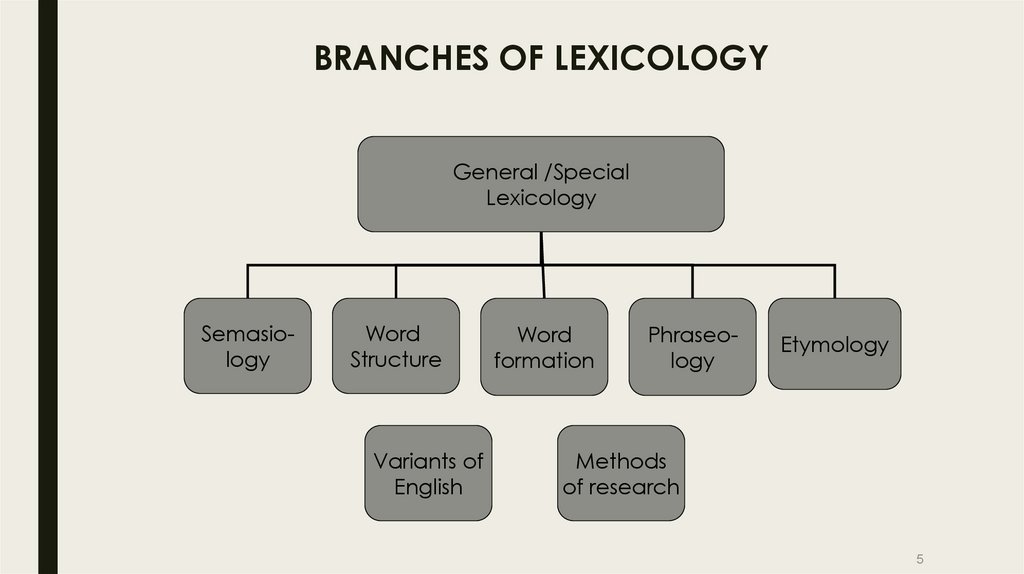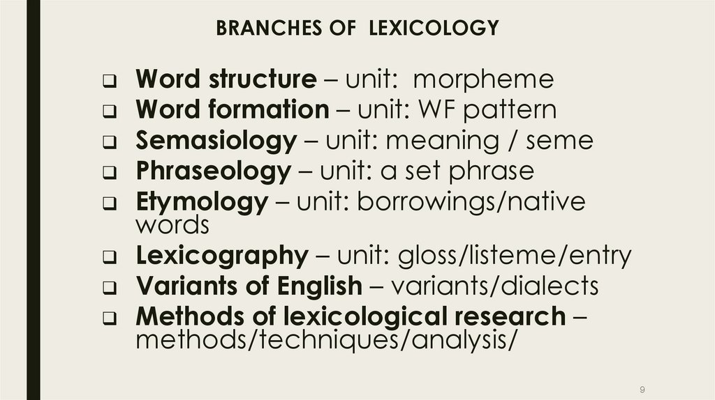 BRANCHES OF LEXICOLOGYWord structure – unit: morpheme