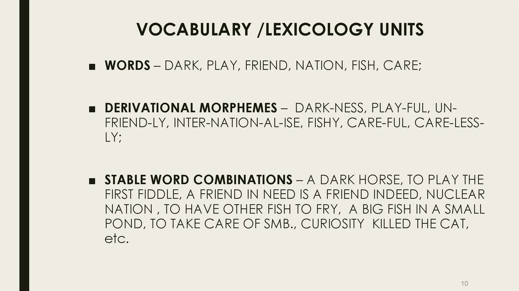 VOCABULARY /LEXICOLOGY UNITS■ WORDS – DARK, PLAY, FRIEND, NATION, FISH, CARE;