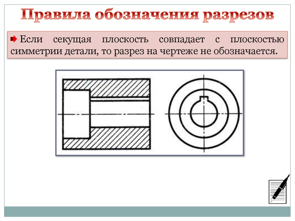 Если секущая плоскость совпадает с плоскостьюсимметрии детали, то разрез на чертеже не обозначается.