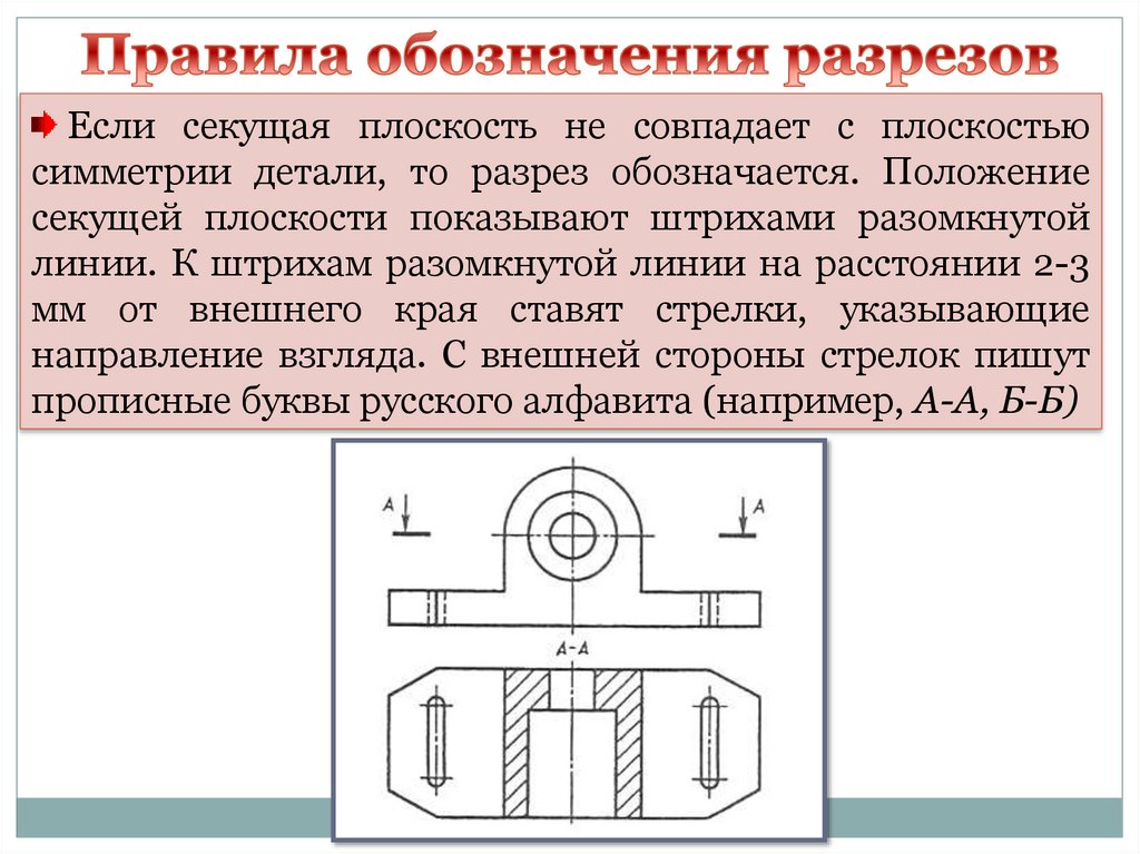Если секущая плоскость не совпадает с плоскостьюсимметрии детали, то разрез обозначается. Положение