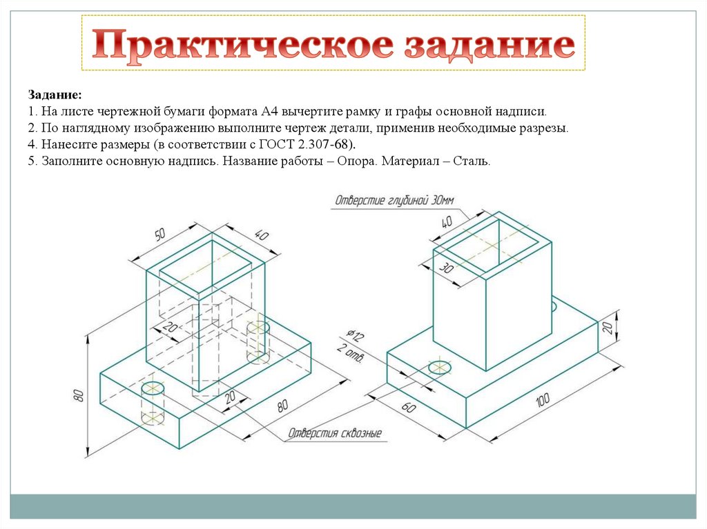 2. По наглядному изображению выполните чертеж детали, применив необходимые разрезы.