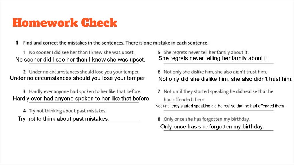 Homework CheckNo sooner did I see her than I knew she was upset.