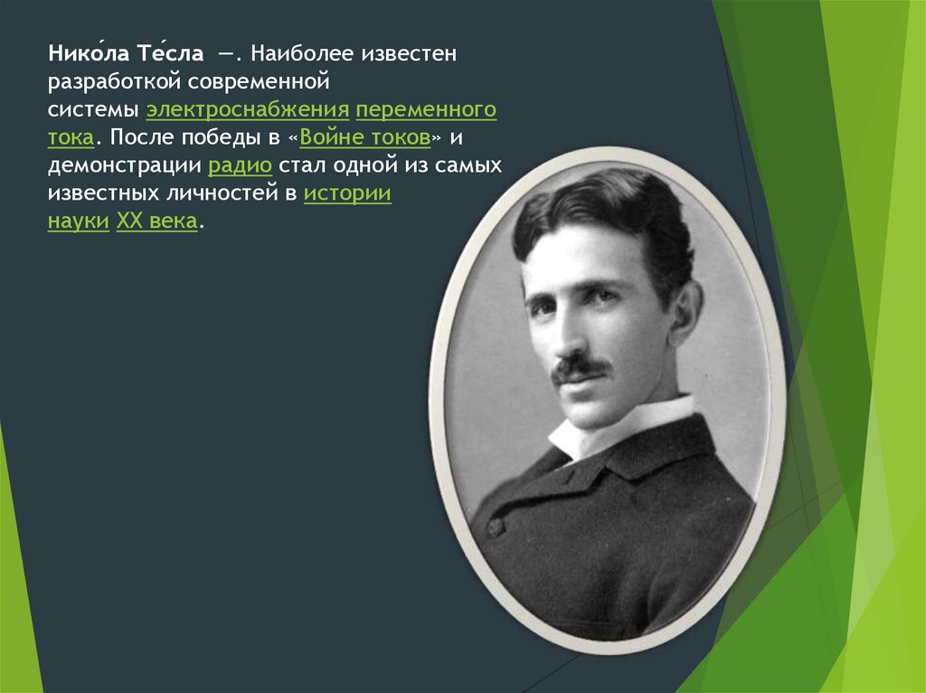 Нико́ла Те́сла —. Наиболее известенразработкой современной