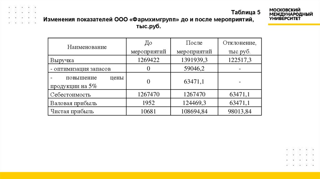 16. Таблица 5 Изменения показателей ООО «Фармхимгрупп» до и после мероприятий, тыс.руб.
