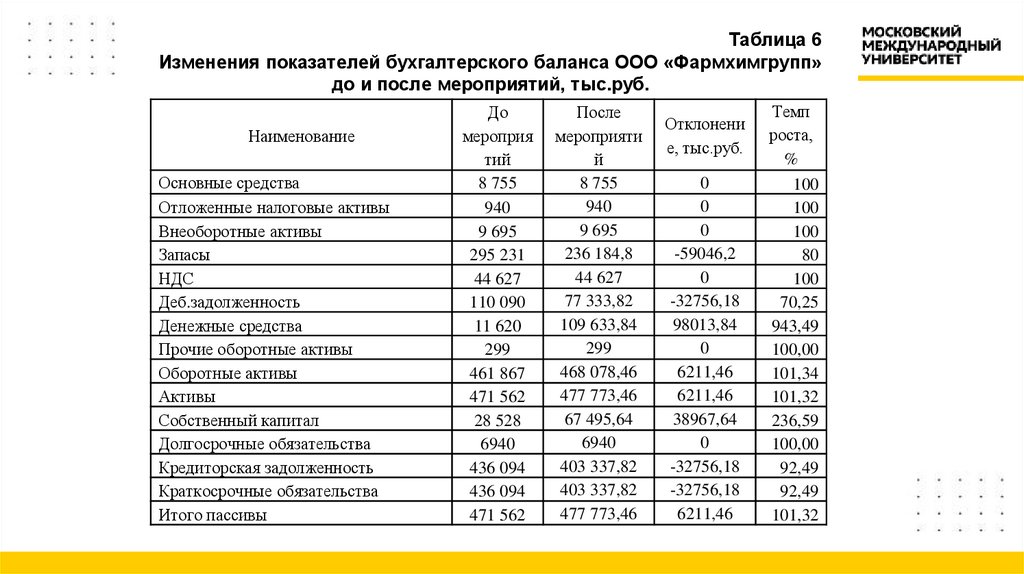 17. Таблица 6 Изменения показателей бухгалтерского баланса ООО «Фармхимгрупп» до и после мероприятий, тыс.руб.