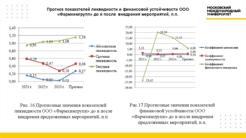 Рис. 16.Прогнозные значения показателейликвидности ООО «Фармхимгрупп» до и после