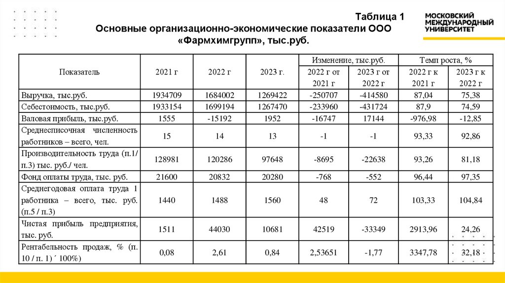 4. Таблица 1 Основные организационно-экономические показатели ООО «Фармхимгрупп», тыс.руб.