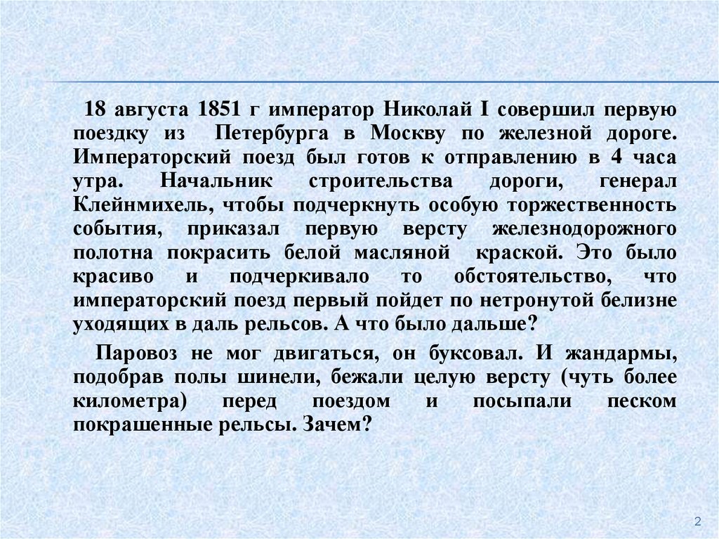 18 августа 1851 г император Николай I совершил первуюпоездку из Петербурга в Москву по железной дороге.