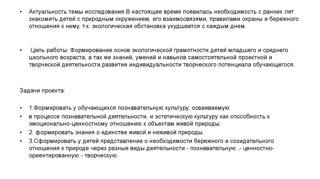 Цель работы: Формирование основ экологической грамотности детей младшего и среднего