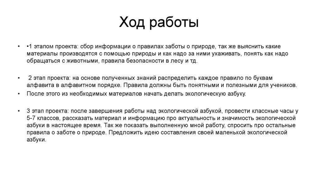 Ход работы•1 этапом проекта: сбор информации о правилах заботы о природе, так же выяснить какие