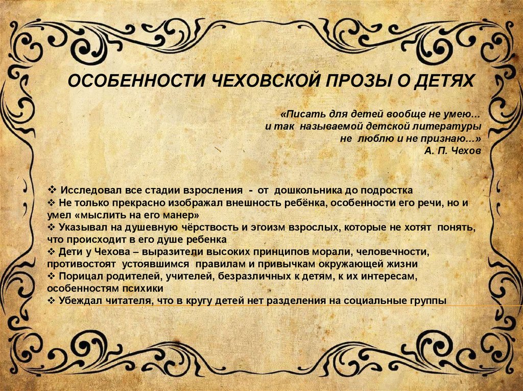 ОСОБЕННОСТИ ЧЕХОВСКОЙ ПРОЗЫ О ДЕТЯХ«Писать для детей вообще не умею…